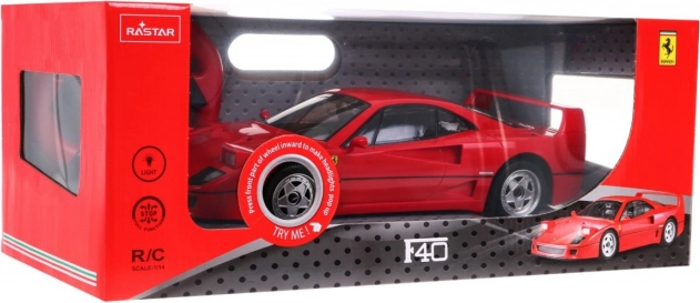 Mașina cu telecomandă licențiată Rastar Ferrari F40 la scara 1:14 încântă prin proporții fidele, lumini față și spate funcționale și faruri retractabile. Datorită suspensiei independente și telecomenzii ergonomice în formă de volan, oferă un control lin înainte/înapoi și viraje, în timp ce caroseria turnată prin injecție evidențiază designul iconic.