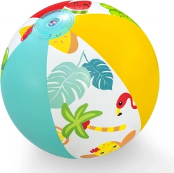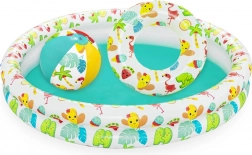 Setul include piscină gonflabilă, colac de înot și minge de plajă – toate asortate într-un design tropical jucăuș. Copiii au imediat la îndemână tot ce le trebuie pentru joacă în apă în siguranță.