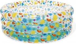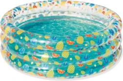 Oferiți-le copiilor bucuria unei răcoriri de vară într-o piscină gonflabilă cu imprimeu vesel cu fructe. Datorită diametrului de 170 cm și înălțimii de 53 cm, oferă suficient spațiu pentru joacă, în timp ce construcția cu trei inele asigură stabilitate, iar fundul gonflabil moale oferă confort. Piscina este ușor de umflat și de golit, ideală pentru copii de la 6 ani.