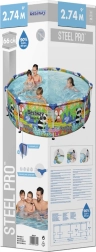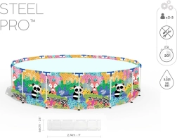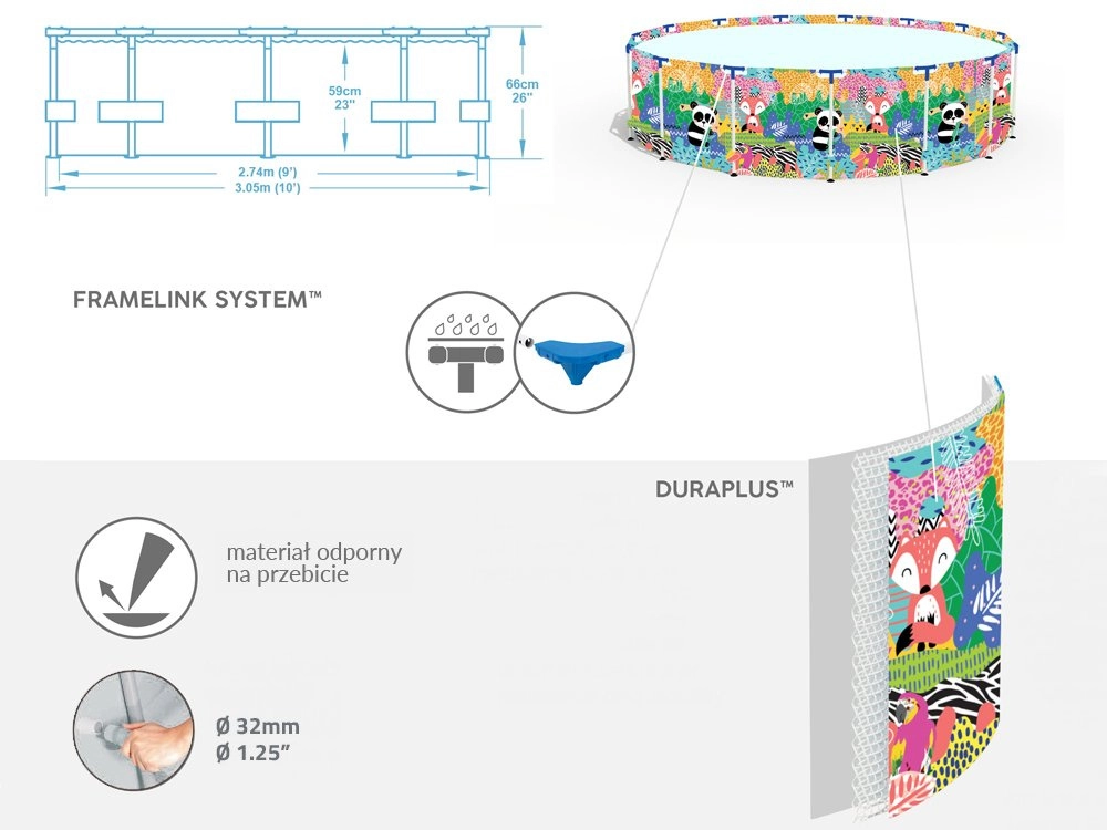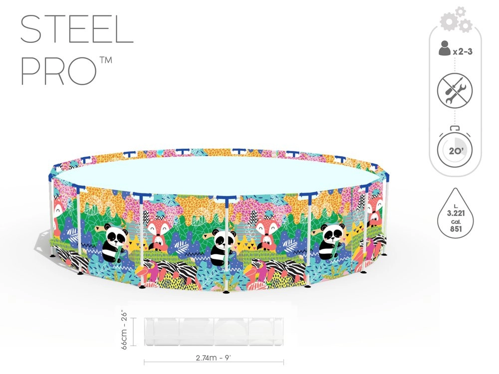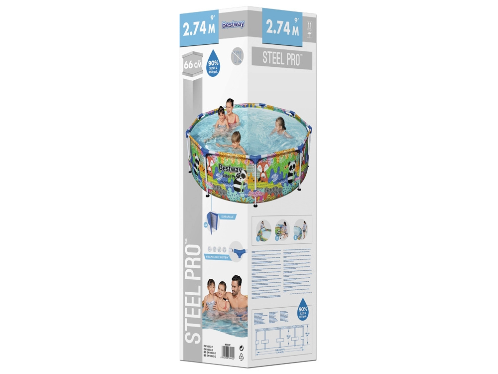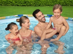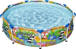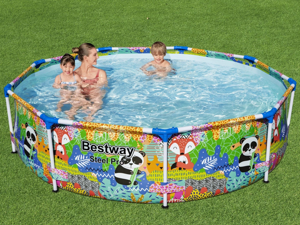Alegerea ideală pentru grădini mici, curți sau terase: piscina rotundă cu cadru BESTWAY cu montaj ușor aduce răcorire și multă distracție pentru copii și părinți. Cadrul stabil din oțel și pereții moi, de calitate, cu grafică veselă cu animale creează un mediu sigur pentru joaca în apă.