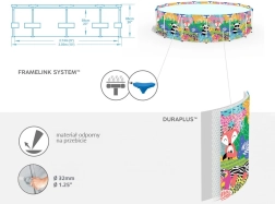 Tehnologia Steel Pro cu FrameLink System minimizează coroziunea la îmbinările metalice, în timp ce materialul în trei straturi DuraPlus (plasă de poliester între două straturi groase de PVC) sporește rezistența la rupere și uzură. Datorită ventilului de scurgere integrat și racordurilor pentru FlowClear, întreținerea piscinei este simplă și rapidă.