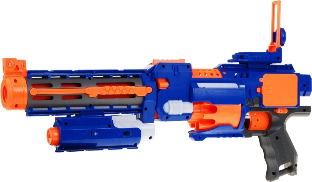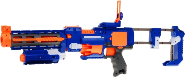Țeava lungă cu role de stabilizare ajută la corectarea traiectoriei săgeților, în timp ce fereastra de service culisantă ușurează eliminarea muniției blocate. Nu lipsesc comutatorul ON/OFF pentru blocarea sigură a trăgaciului, încărcarea frontală și vizorul laser practic pentru o țintire mai bună. În pachet găsești 20 de proiectile din spumă, astfel că poți începe joaca imediat.