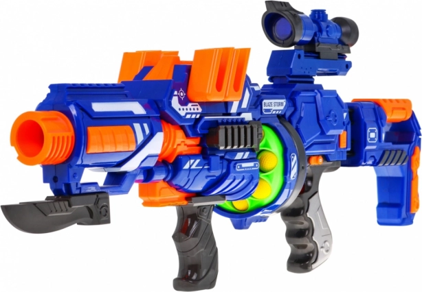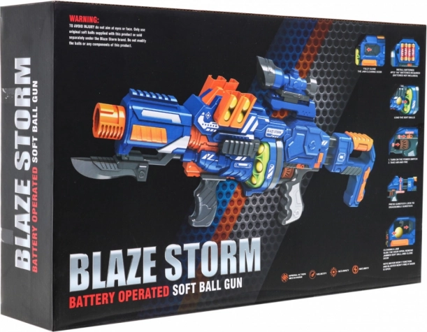 Distractiv și sigur, blasterul din spumă BLAZE STORM îi va încânta pe copiii mai mari și adolescenții de la 14 ani. Oferă mod de tragere electric complet automat, încărcare cu tambur și cadență rapidă. Datorită ferestrei pentru eliberarea bilelor blocate și prinderii confortabile, jocul este cursiv și lipsit de griji. Pachetul include 12 bile moi din spumă.