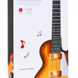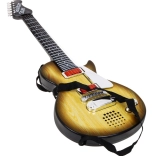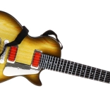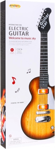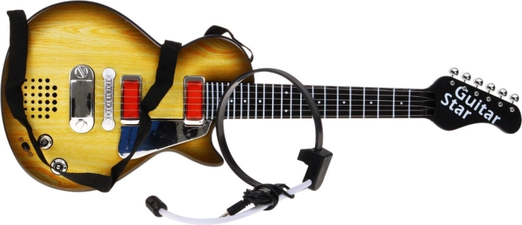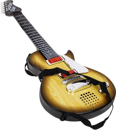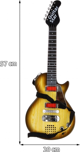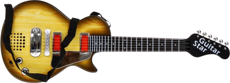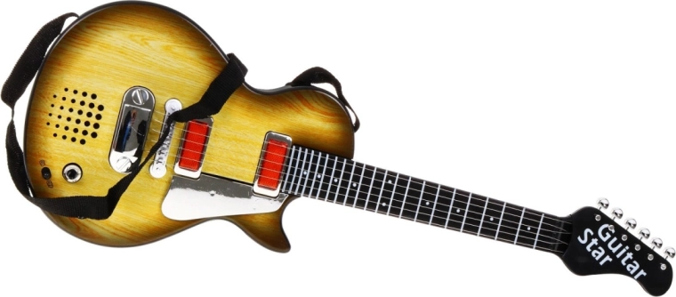 Această chitară stilată pentru copii, cu design ce imită lemnul, este alegerea ideală pentru micii muzicieni. Datorită dimensiunilor compacte, se potrivește perfect copiilor de la 3 ani și îi motivează să descopere ritmul și creativitatea muzicală. Chitara este echipată cu șase corzi metalice, care emit sunete la atingere, și oferă două moduri – redarea unui fundal rock și cântatul la corzi.