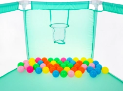 Include un coș distractiv pentru primele „aruncări” și un set de 50 de bile ușoare (aprox. 5 cm), care încurajează mișcarea și dezvoltă coordonarea mână–ochi și motricitatea fină.