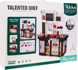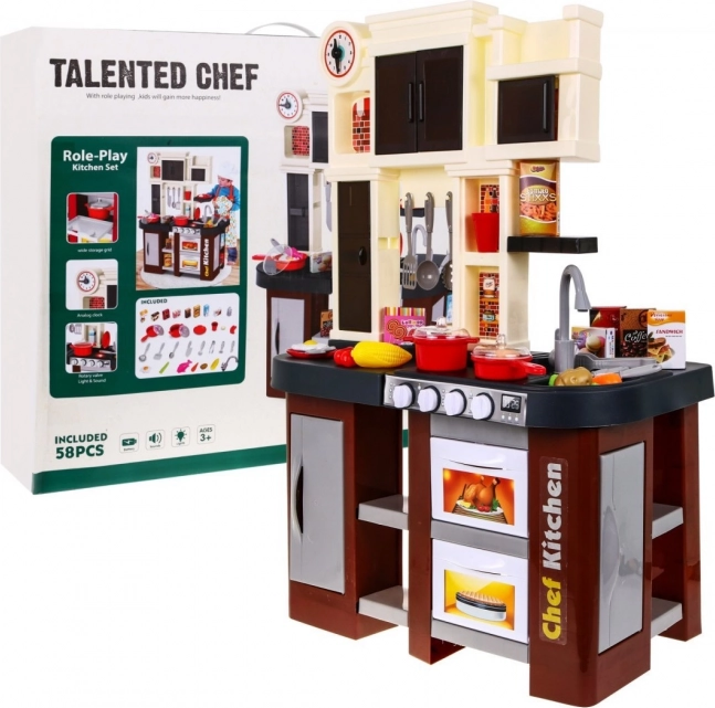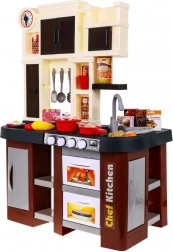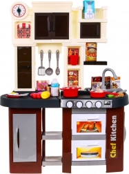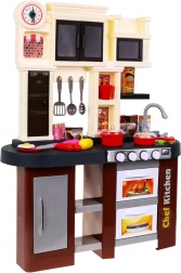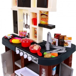 Această bucătărie pentru copii de calitate, în combinație maro-negru, oferă o experiență realistă de gătit. La rotirea butoanelor, arzătoarele se aprind și se aud sunete autentice de gătit și prăjit. Datorită robinetului cu apă curentă, micii bucătari pot exersa spălarea reală a vaselor și pregătirea mâncărurilor.