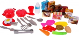 Tigăi, oale cu capace, farfuriuțe, tacâmuri, ustensile de bucătărie, dar și legume, ouă și alte „alimente” pentru scenarii nesfârșite de joacă.