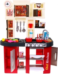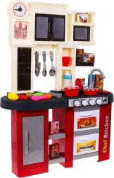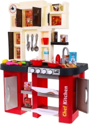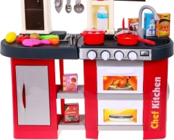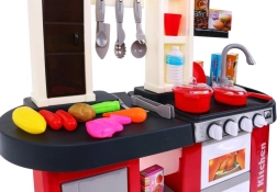 Această bucătărie spațioasă din plastic, în design roșu-negru, oferă copiilor de la 3 ani o experiență autentică de gătit. Efectele luminoase reale și sunetele de gătit și prăjit la rotirea butoanelor susțin jocul creativ și dezvoltarea motricității. Include și un robinet funcțional, care duce distracția la următorul nivel.