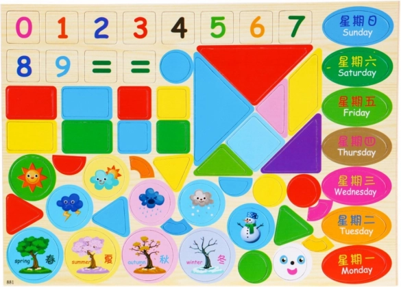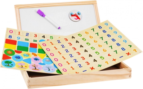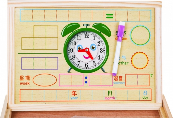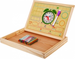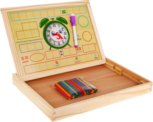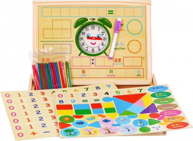 Acest set de calitate din lemn este conceput pentru a le oferi copiilor multiple posibilități de învățare și distracție. Îi ajută să se familiarizeze cu numerele, adunarea, scăderea, înmulțirea și împărțirea, îi învață să se orienteze în timp datorită ceasului magnetic și să recunoască formele, zilele săptămânii, vremea și anotimpurile. Tabloul magnetic cu două fețe și markerul ștergător susțin exersarea repetată fără mizerie.