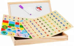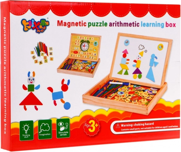 Cutia practică din lemn servește ca spațiu de depozitare pentru toate accesoriile, iar pe partea inferioară găsești tabla înmulțirii pentru verificarea rapidă a rezultatelor. Cu ajutorul cardurilor și instrucțiunilor incluse, copiii pot alcătui imagini din forme magnetice și își pot dezvolta astfel creativitatea și motricitatea fină.