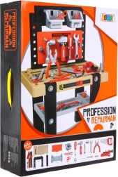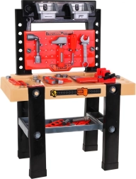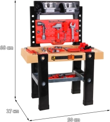 Detalii realiste precum menghina, șuruburile, piulițele și șipcile „din lemn” cu găuri invită la nesfârșite activități de înșurubare, măsurare și inventare de proiecte proprii. Copiii învață într-un mod distractiv bazele procedurilor de lucru, sortarea și recunoașterea uneltelor.