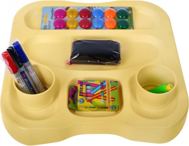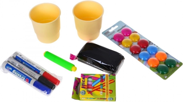 Pachetul include pahare de plastic, set de markere, cretă, magneți și suport pentru cretă, care susțin toate tipurile de activități artistice.