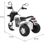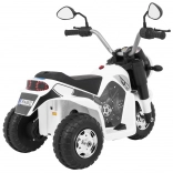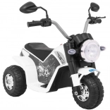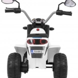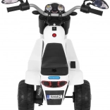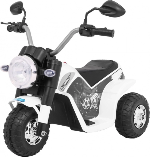 Motocicleta electrică pentru copii MiniBike, în eleganta culoare albă, oferă copiilor distracție în siguranță și primele experiențe de condus. Datorită celor trei roți este stabilă, are faruri LED frontale, sunet de pornire a motorului și melodii pe volan. Este propulsată de un motor RS380 6 V cu acumulator 6 V / 4,5 Ah, iar confortul este asigurat de șaua din ecopiele neagră.