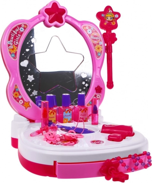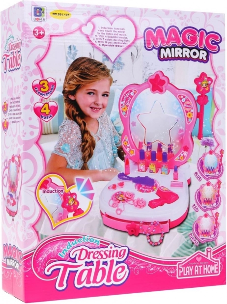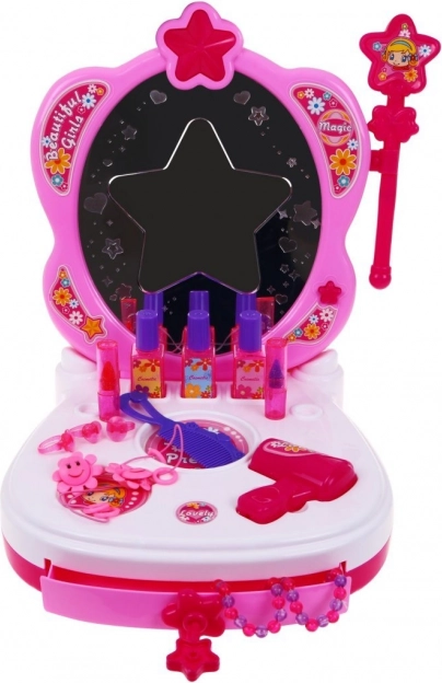 Această măsuță de toaletă interactivă roz, cu oglindă stelară, luminează camera copilului. Oglinda strălucește în trei culori (albastru, roșu, roz) și este completată de patru melodii pentru o atmosferă magică. Datorită accesoriilor bogate, copiii pot imita cu ușurință ritualurile preferate de frumusețe și se pot cufunda în lumea machiajului și coafurilor fantastice.