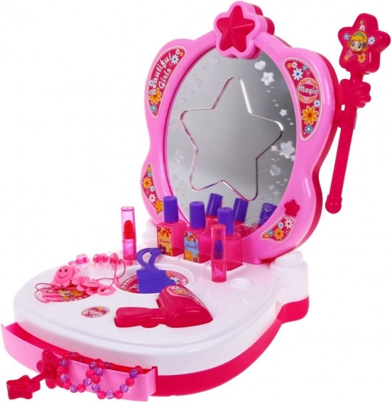 Setul este proiectat pentru un joc sigur și plăcut – include cosmetice de jucărie, un uscător pentru copii, un pieptănaș, bijuterii și o baghetă magică, cu care orice fetiță se poate simți ca o prințesă. Dimensiunile compacte îl fac o jucărie portabilă excelentă atât pentru călătorii, cât și pentru acasă.