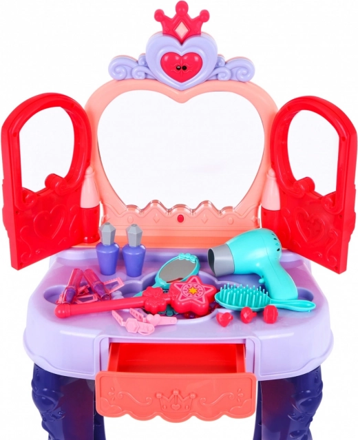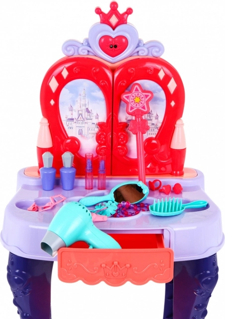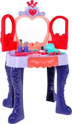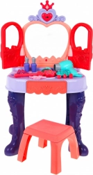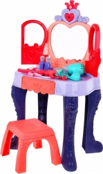 Măsuța are un sertar culisant practic pentru toate mărunțișurile și un set bogat de accesorii: pieptene, oglinjoară, inele, brățări, agrafe, elastice și imitări de rujuri și parfumuri. Construcția stabilă, dimensiunile plăcute și scăunelul confortabil asigură comoditate la joacă și amplasare ușoară în camera copilului.