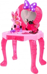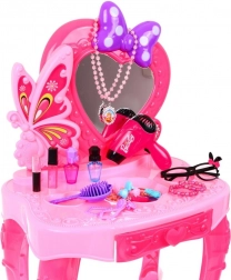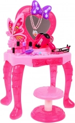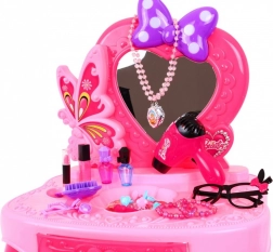 Această măsuță de toaletă roz pentru copii transformă orice cameră într-un colțișor cosmetic fermecat. Oglinda în formă de inimă este decorată cu o fundiță cu efecte luminoase și o melodie plăcută, care stimulează imaginația în jocul de salon de frumusețe. Este inclus și un foen-jucărie funcțional cu sunet real și suflare, făcând jocul și mai autentic.