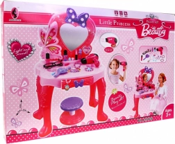 Sertarul practic ascunde toate mărunțișurile, iar scaunelul inclus asigură o ședere confortabilă. Setul bogat de bijuterii și recuzită cosmetică le permite copiilor să descopere stilul, să-și dezvolte motricitatea fină și abilitățile sociale în joaca împreună.