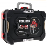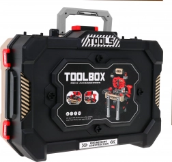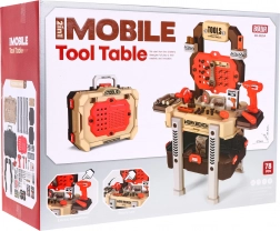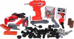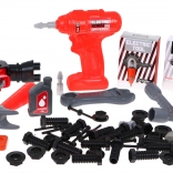 Conținutul pachetului (selecție din 78 buc.): geantă, stativ, bormașină/șurubelniță cu capete interschimbabile, fierăstrău, ciocan, șurubelniță în cruce, cheie tubulară și reglabilă, piese din lemn, șuruburi, piulițe, autocolante și alte accesorii.