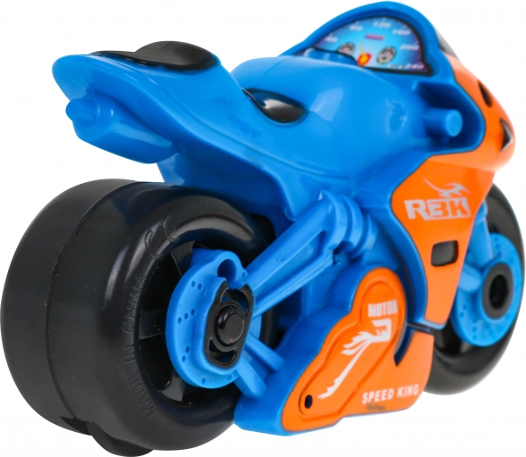 Motocicletă stilată în combinație de culori albastru și portocaliu cu inscripția 'Speed King' pentru jocuri de curse palpitante.