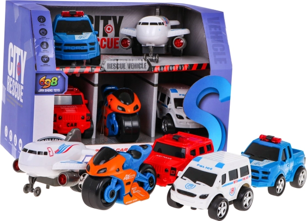 Bucurați-vă de un set distractiv de jucării care conține cinci vehicule diferite - trei mașini de poliție, un avion și o motocicletă. Fiecare model este proiectat să aducă bucurie copiilor și să le stimuleze imaginația.