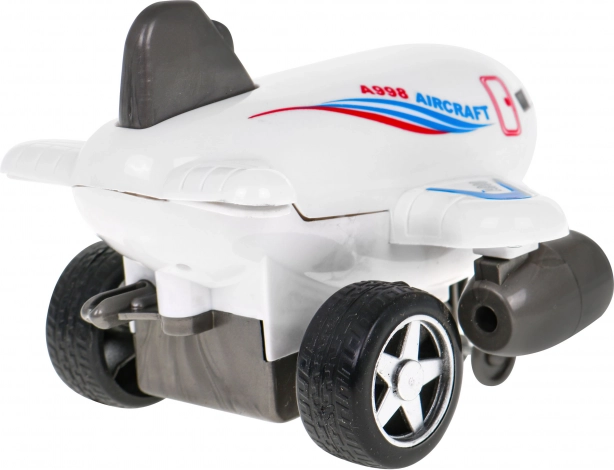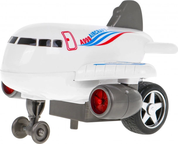 Avion alb potrivit pentru copii, vine cu un design realist și posibilitatea de mișcare datorită roțițelor.