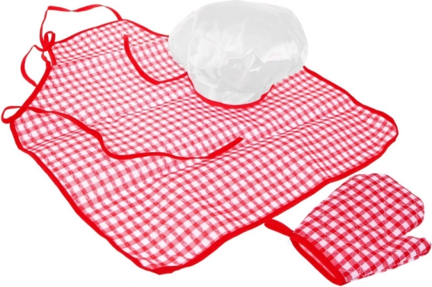 Include costum cu șorț, bonetă și mănușă de bucătărie în combinație carouri roșu-alb – copiii se simt imediat ca adevărați chefi.