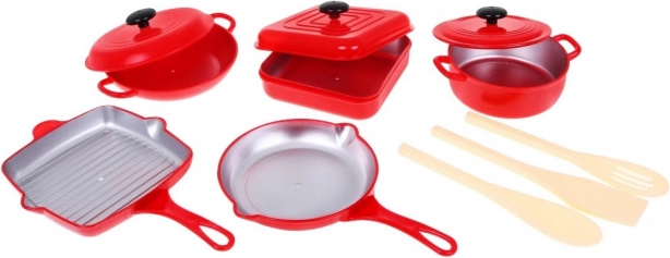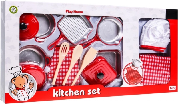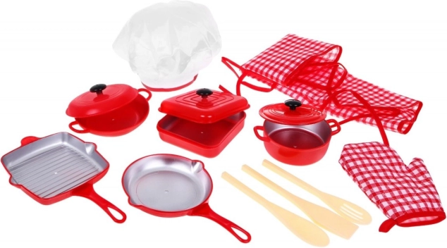 Acest set de bucătărie roșu este ideal pentru jocul de-a casa, bucătăria sau restaurantul. Copiii primesc vase cu capace, tigăi și tacâmuri care arată realist, plus întregul outfit de bucătar. Totul este conceput în culoarea roșie îndrăgită și în dimensiuni potrivite pentru mâinile mici.