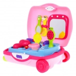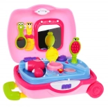 Sunt incluse oglindă mare și mică, uscător de păr, pieptene, perie, „parfum” și „ruj” (reproduceri decorative). După joacă, totul se strânge ușor înapoi în trolerul pe roți cu mâner extensibil – soluția ideală pentru cameră și călătorii.