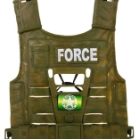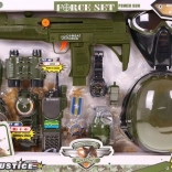 - Vestă cu închidere, mască cu ochelari, cască, pușcă cu vizor, binoclu, grenadă, ceas, fluier, insignă/medalie, stație radio (cu baterii), busolă, căști, cuțit din plastic sigur, cutie de tinichea, breloc