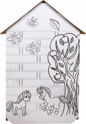 Pereții albi cu contururi negre ale cailor invită la desen și colorat cu creioane sau markere. Copiii își creează un aspect unic al căsuței și își dezvoltă imaginația.