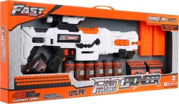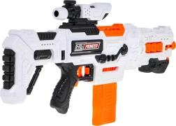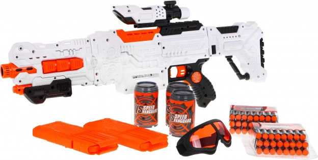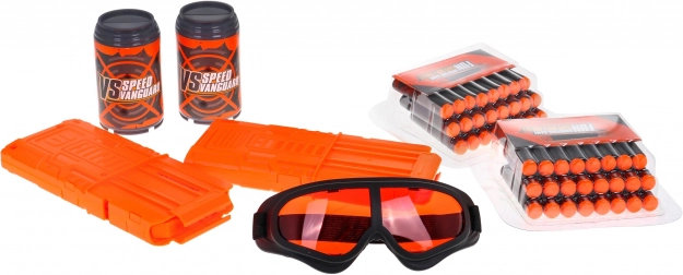 - Blaster, 2× magazie, 48× săgeată din spumă, 3× țintă (doză), ochelari de protecție
