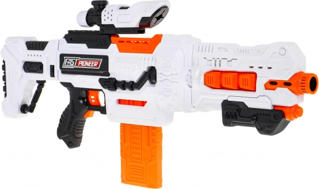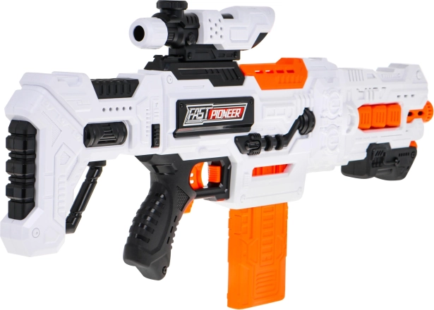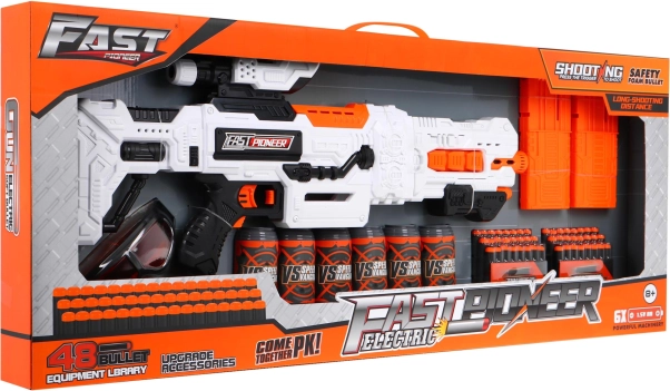 Blasterul electric semi-automat FAST PIONEER este ideal pentru bătălii acasă și antrenament de precizie. Doar încărcați magazia, țineți apăsat butonul de alimentare, țintiți prin vizorul reglabil și apăsați trăgaciul. Săgețile moi din spumă cu vârf de cauciuc sunt delicate și potrivite pentru joacă în siguranță.