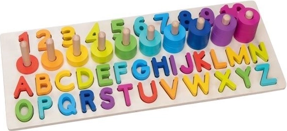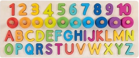 Puzzle-ul nostru conține 91 de elemente diferite, inclusiv o bază din lemn, litere (26 bucăți) și cifre de la 1 la 10, și 55 de inele colorate. Copiii pot astfel să exerseze cu ușurință recunoașterea și adunarea numerelor, precum și crearea de cuvinte simple.