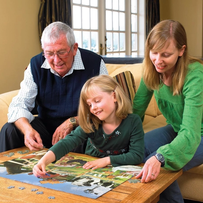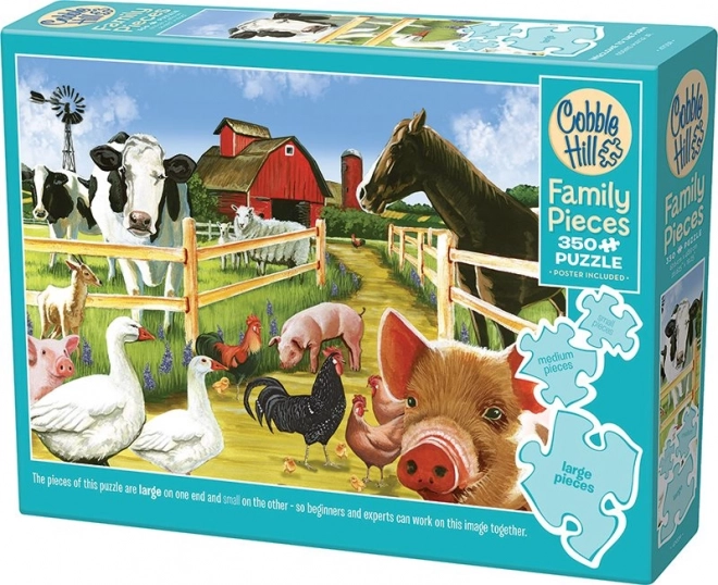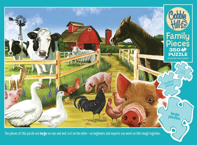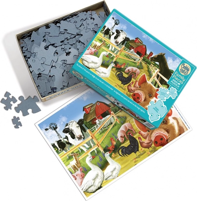 Puzzle de familie marca Cobble Hill cu motivul „Bine ați venit la fermă” oferă o combinație unică de piese în trei dimensiuni. Distracție ideală pentru întreaga familie, de la cei mai mici până la bunici!