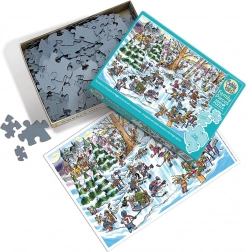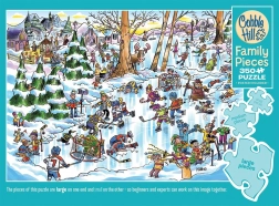 Puzzle-ul de familie COBBLE HILL Orășelul hocheiului este conceput astfel încât întreaga familie să se poată bucura de asamblare în același timp. Piesele mari sunt concentrate într-o zonă a motivului și sunt ideale pentru copiii mai mici, piesele medii pentru copiii mai mari și bunici, iar piesele mai mici pentru adulți și asamblatori mai experimentați. Ilustrația de iarnă, colorată, cu hochei și patinaj pe lac, are un aer optimist și arată grozav și ca tablou final.