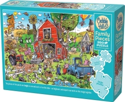 Bucurați-vă de asamblarea împreună cu puzzle-ul de familie COBBLE HILL „Ferma trăsnită” cu 350 de piese. Pachetul conține piese în trei mărimi diferite – pentru copii, părinți și bunici. Formele nestandard cresc distracția și provocarea, în timp ce organizarea clară a motivului pe mărimi facilitează colaborarea întregii familii.