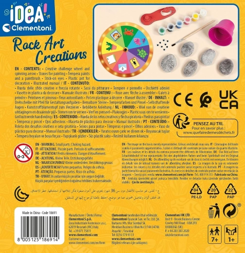 Dezvoltați fantezia copiilor cu setul creativ Clementoni IDEA pentru decorarea pietrelor. Creați pietricele originale cu ajutorul vopselelor tempera, ochilor autoadezivi și provocărilor amuzante. Setul susține creativitatea, motricitatea fină și imaginația și este grozav pentru creații realizate împreună de copii și părinți.