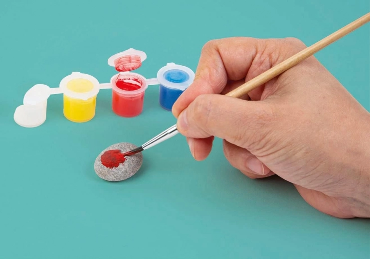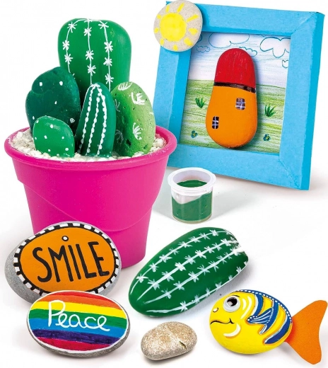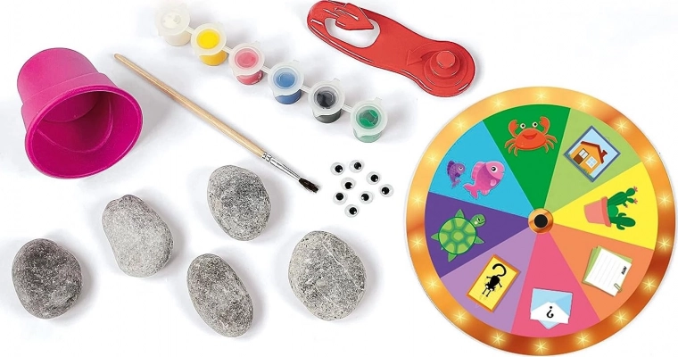 Acest set creativ oferă tot ce au nevoie copiii pentru a crea pietricele colorate – de la pietre de mărimi diferite la vopsele tempera și până la ochi autoadezivi. Include și o rotiță cu provocări distractive care le sugerează copiilor ce motive să încerce și cum să compună mici aranjamente din pietre.