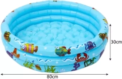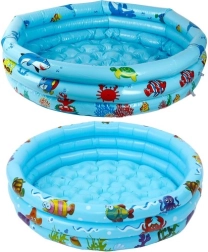 - Specificații – material: PVC, alte: cauciuc; culoare: albastru/multicolor; capacitate: 58 l; formă: rotundă; tip: gonflabil; dimensiuni (diametru/înălțime): 80 x 30 cm; greutate: 508 g; greutate ambalaj: 579 g.