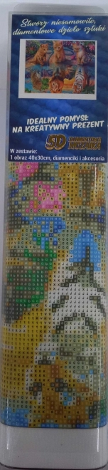 Pictură cu diamante - procedură: Partea superioară a pânzei este acoperită cu adeziv și protejată cu o folie transparentă. Îndepărtați folia treptat, pe porțiuni, pe măsură ce aplicați pietricelele. Pânza conține simboluri care sunt indicate în legenda inclusă și corespund pungilor numerotate cu pietricele. Turnați pietricelele din punga respectivă în tăviță, încărcați vârful stiloului cu ceară și începeți să creați imaginea cu propriile pietricele.