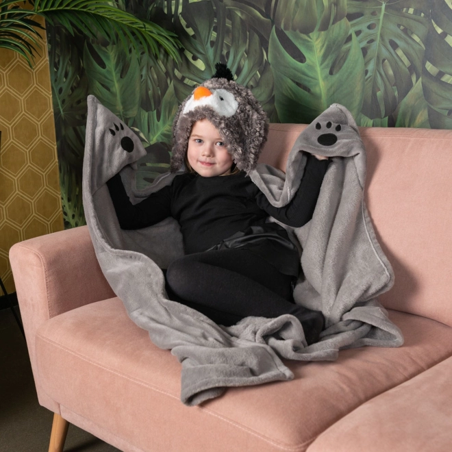 Pătură pentru copii cu glugă, drăguță și funcțională, în stil pinguin, pentru confort acasă și în călătorii. Din fleece moale, cu glugă cu motiv de animal și buzunare tip lăbuțe pentru mâini. Oferă căldură și finețe, stimulează imaginația în joacă și se întreține ușor.