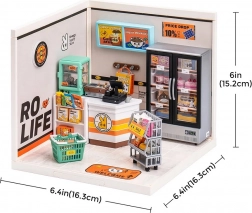 Descoperă farmecul miniaturilor cu căsuța „Magazin de provizii” de la ROBOTIME. Kitul vine în stare neasamblată și, după montaj, creează o scenă primitoare a unui mic magazin deschis „24/7”. Datorită iluminării LED, toate detaliile mărunte ies în evidență, iar modelul devine o decorațiune originală pentru raft sau birou.