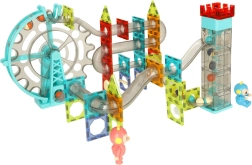 Acest set magnetic colorat le permite copiilor să construiască turnuri stabile, tuneluri și structuri 3D, urmărind cum bilele trec prin tuburi și rampe transparente. Modulul cu roată rotativă și lift menține bilele în mișcare, iar elementul sonor adaugă o melodie plină de bucurie jocului. Piesele sunt din plastic rezistent, transparent, cu magneți care facilitează construcția rapidă și creativă.