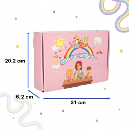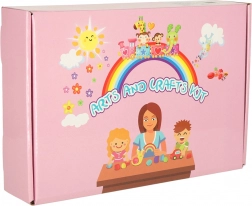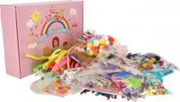 Conținutul pachetului include, printre altele: sârmulițe pufoase și sclipitoare, bețișoare din lemn, hârtii colorate, seturi de autocolante, ochi mobili și colorați, pompoane, pene, mărgele inclusiv cu litere, șnur din plastic pentru înșirat și foarfecă sigură. Totul este așezat într-o cutie roz frumoasă, ideală și pentru a fi oferită cadou.