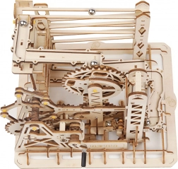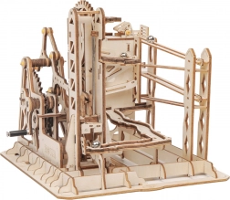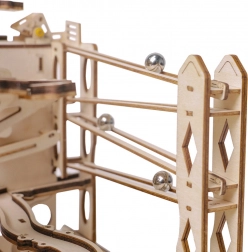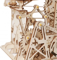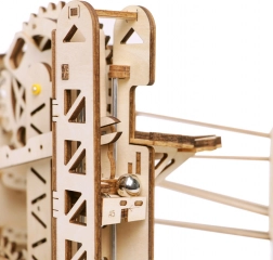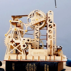 Acest model mecanic din lemn îmbină frumusețea științei și a ingineriei într-o pistă captivantă pentru bile. Prin acționarea manuală cu manivelă pui în mișcare sistemul de roți dințate, iar liftul ghidează precis bilele pe trasee cu șine oscilante și drepte. În mod natural îți dezvolți gândirea tehnică, imaginația și motricitatea fină.