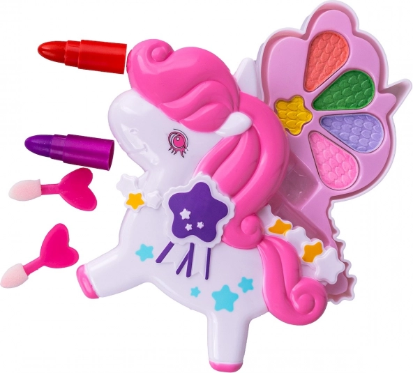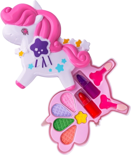 Acest set fermecător de machiaj în formă de unicorn este ideal pentru primii pași în machiaj. Copiii se bucură de un joc sigur și amuzant, care stimulează imaginația și motricitatea fină. Aripile rabatabile dezvăluie o paletă de farduri de ochi vibrante, iar rujul nu lipsește pentru un strop de culoare pe buze.
