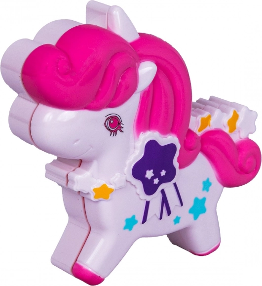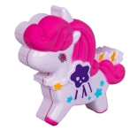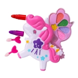 Designul unicornului alb cu coamă roz stimulează imaginația și transformă machiajul într-o activitate distractivă.