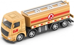 Autocisternă bej, cu rezervor cilindric, dungi roșii și logo, oferă mișcare lină datorită roților care se rotesc liber. Ideală pentru joaca de transport al lichidelor și pentru extinderea „lumii transportului” a copiilor.
