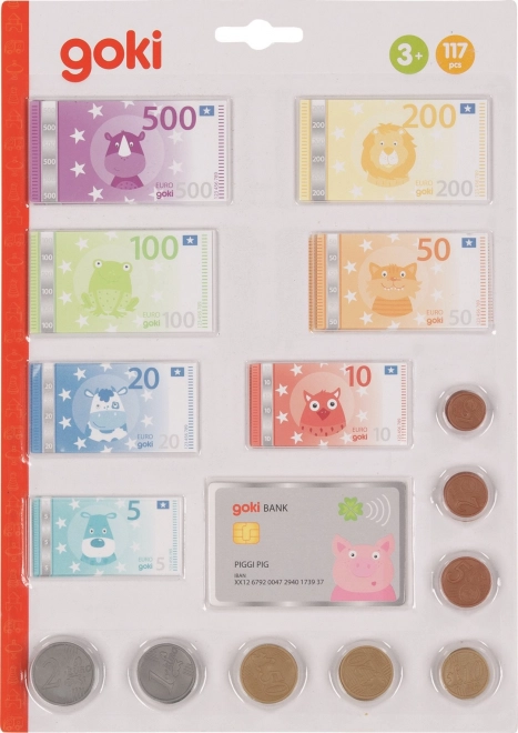 Banii pentru copii Euro cu animale de la marca GOKI oferă ocazia perfectă pentru a învăța valoarea banilor și a exersa calculul în joacă. Setul include monede și bancnote adaptate excelent dimensiunilor caselor de marcat pentru copii, toate cu motive de animale în culori corespunzătoare bancnotelor reale.